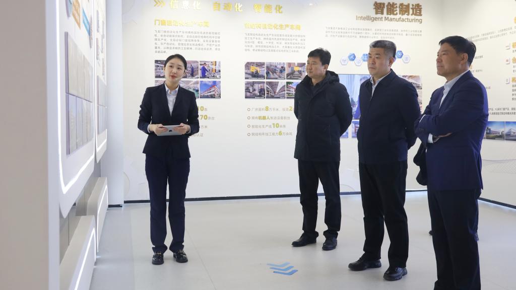 初磊一行走进飞龙集团企业展厅,通过观看专题宣传片系统了解了企业深耕行业的发展脉络、厚植于心的企业文化与多元协同的产业布局,对集团的综合实力与发展战略形成全面认知。随后,走访人员深入飞龙钢构、门窗智能制造工厂一线,实地观摩现代化生产流水线的高效运转与智能制造工艺的精准应用,直观感受企业在生产制造领域的硬核实力。在飞龙创新研发中心,重点参观了超低能耗建筑示范项目及科技成果展厅,通过与企业技术负责人深入交流,详细了解了新型环保建材研发、绿色建筑技术创新等方面的核心突破,对集团以科技创新驱动产业升级的发展路径有了更深刻的认识。