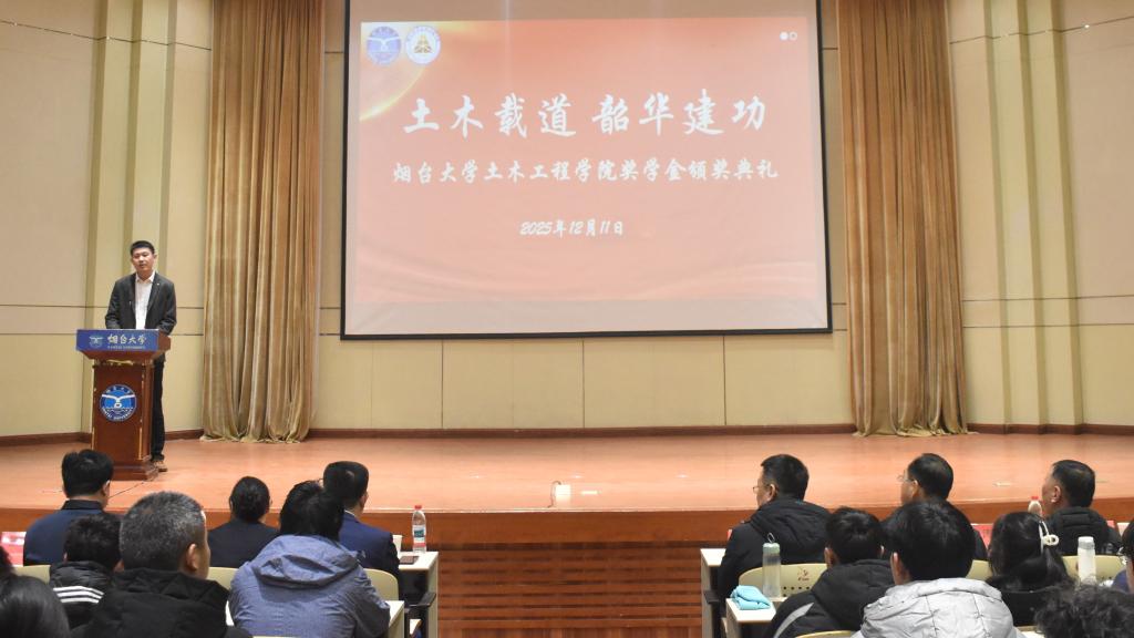 为表彰先进,宣传典型,持续深化学风内涵建设,12月11日,土木工程学院在致道厅举行2025年“土木载道,韶华建功”奖学金颁奖典礼暨第二届构造节开幕仪式。荣华建设集团有限公司副总裁董建明、山东意林建筑规划设计研究院有限公司执行董事兼总经理马建刚,烟台飞龙集团有限公司党委副书记吕昌梅,烟台大学学生工作处、校团委有关负责人,学院领导班子成员、获奖学生代表参加活动。