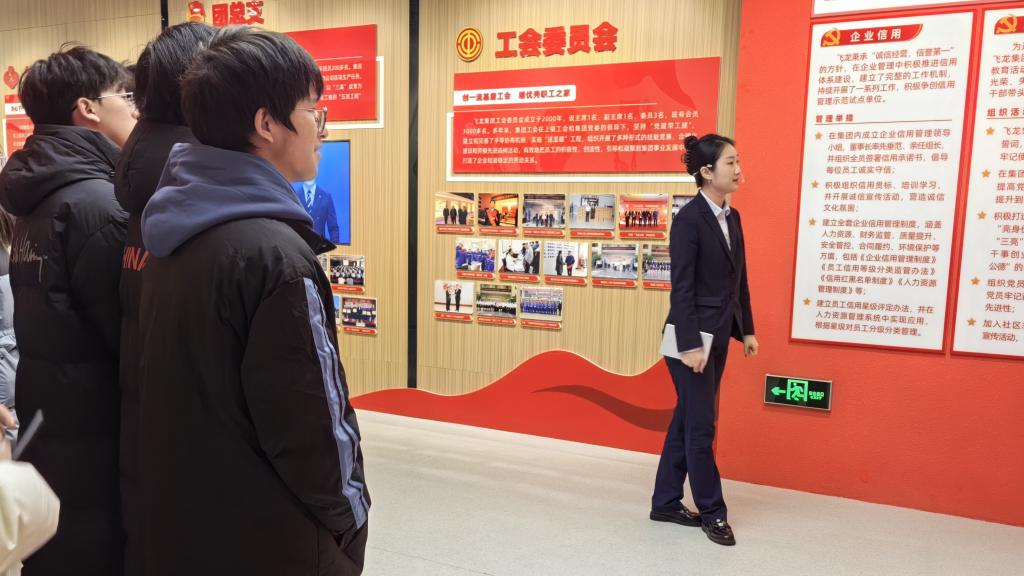 同学们首先参观了第一展厅,沿着企业发展时间轴,系统了解了飞龙集团自1984年创立以来,从单一建筑施工业务逐步拓展为集工程建设等为一体的综合性企业集团。