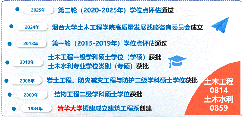 烟台大学土木工程学院创建于1984年,拥有土木工程一级学科硕士学位授权点和土木水利专业领域硕士学位授权点,包含土木工程新结构与新材料、防灾减灾工程及防护工程、岩土与隧道工程、道路桥梁工程及市政工程六个主要研究方向。