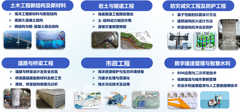 在清华大学土木工程学科持续援建下,本学位点聚焦海洋特色,依托国家虚拟仿真工程力学实验教学中心等10余个省部级教学科研平台,在海洋工程新结构与新材料,海洋岩土与地下工程,黄河流域生态保护,智慧水利,及基础设施智能建造与绿色建筑材料研发等领域形成了具有一定影响、特色比较鲜明的科研方向和导学团队,并不断探索和创新“产学研”结合模式,旨在加强新时代土木卓越研究生人才培养。
